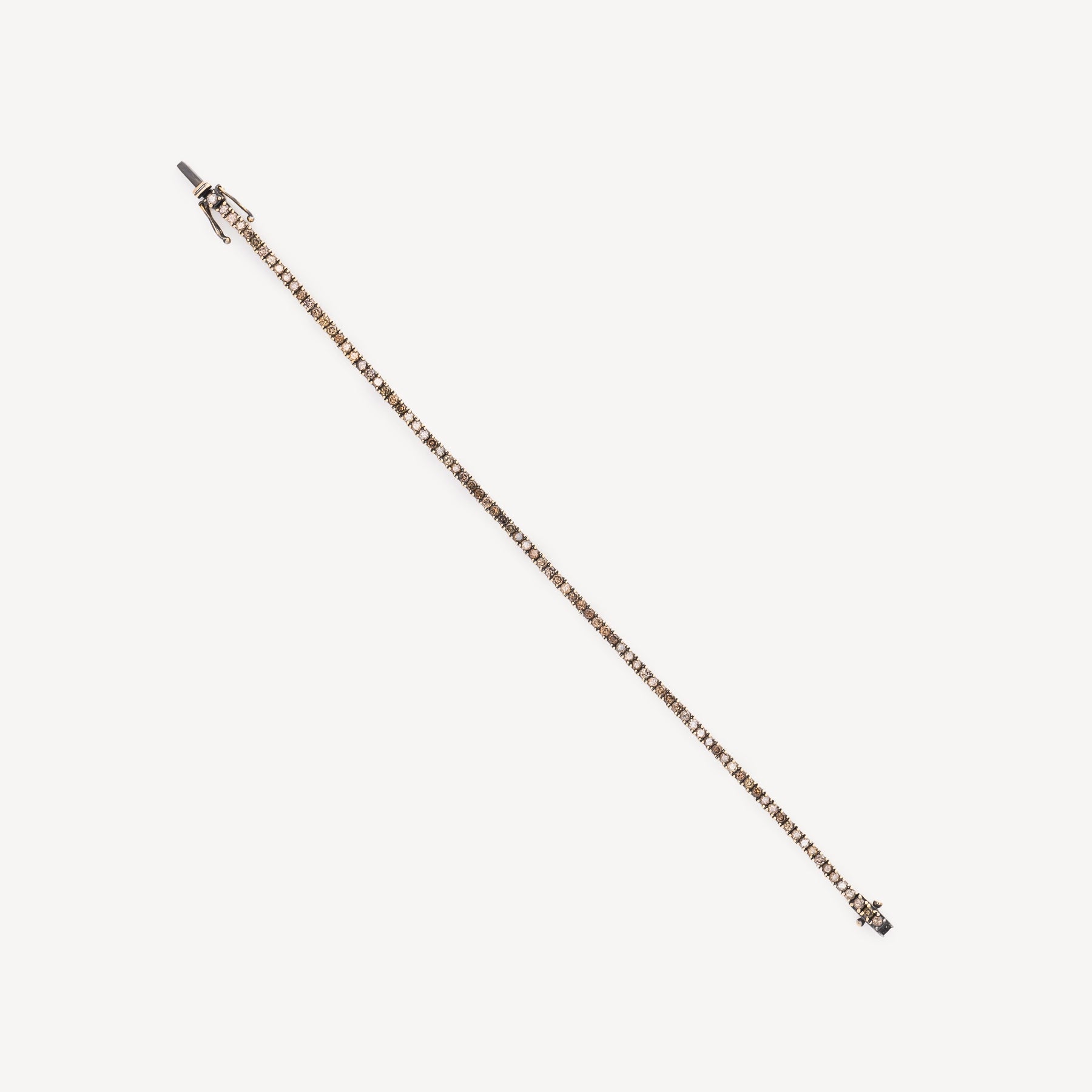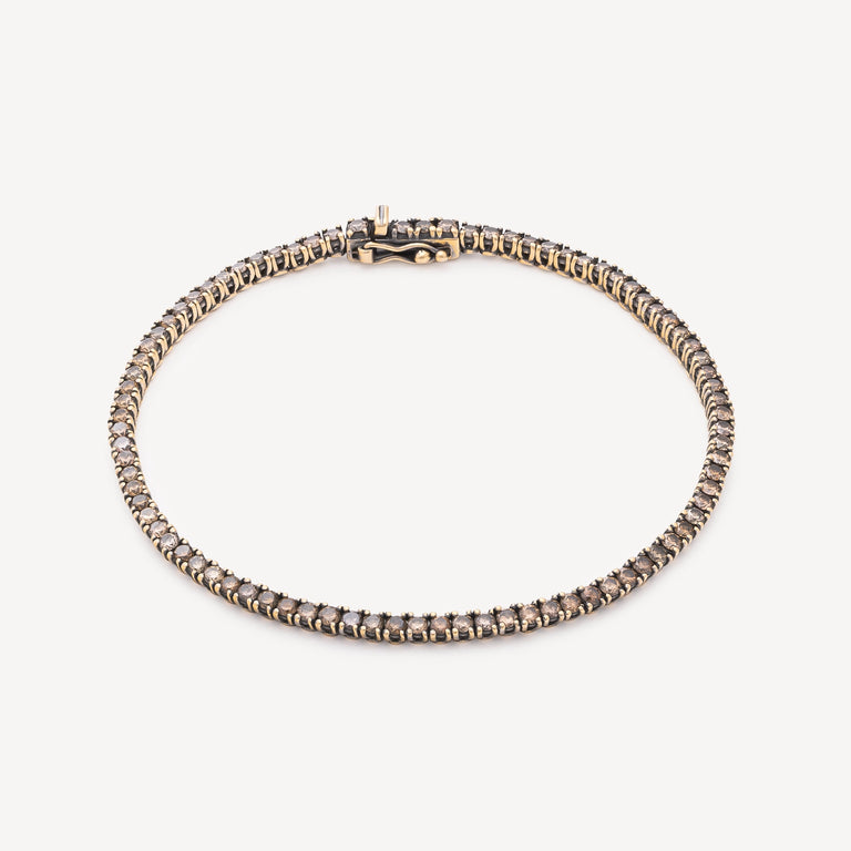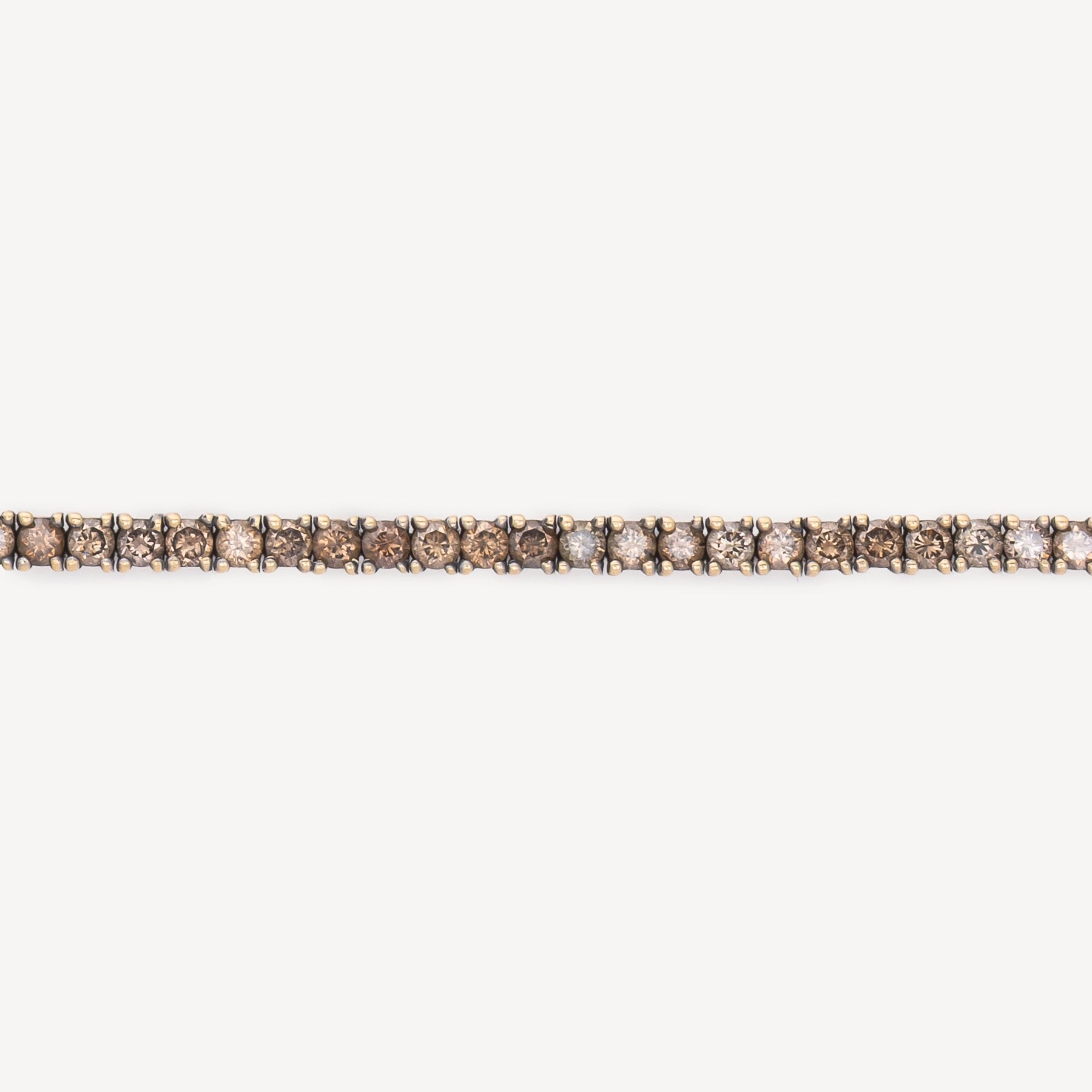 Un bracelet tennis d’une élégance intemporelle en or, délicatement pavé de diamants couleur champagne aux reflets doux et lumineux.
