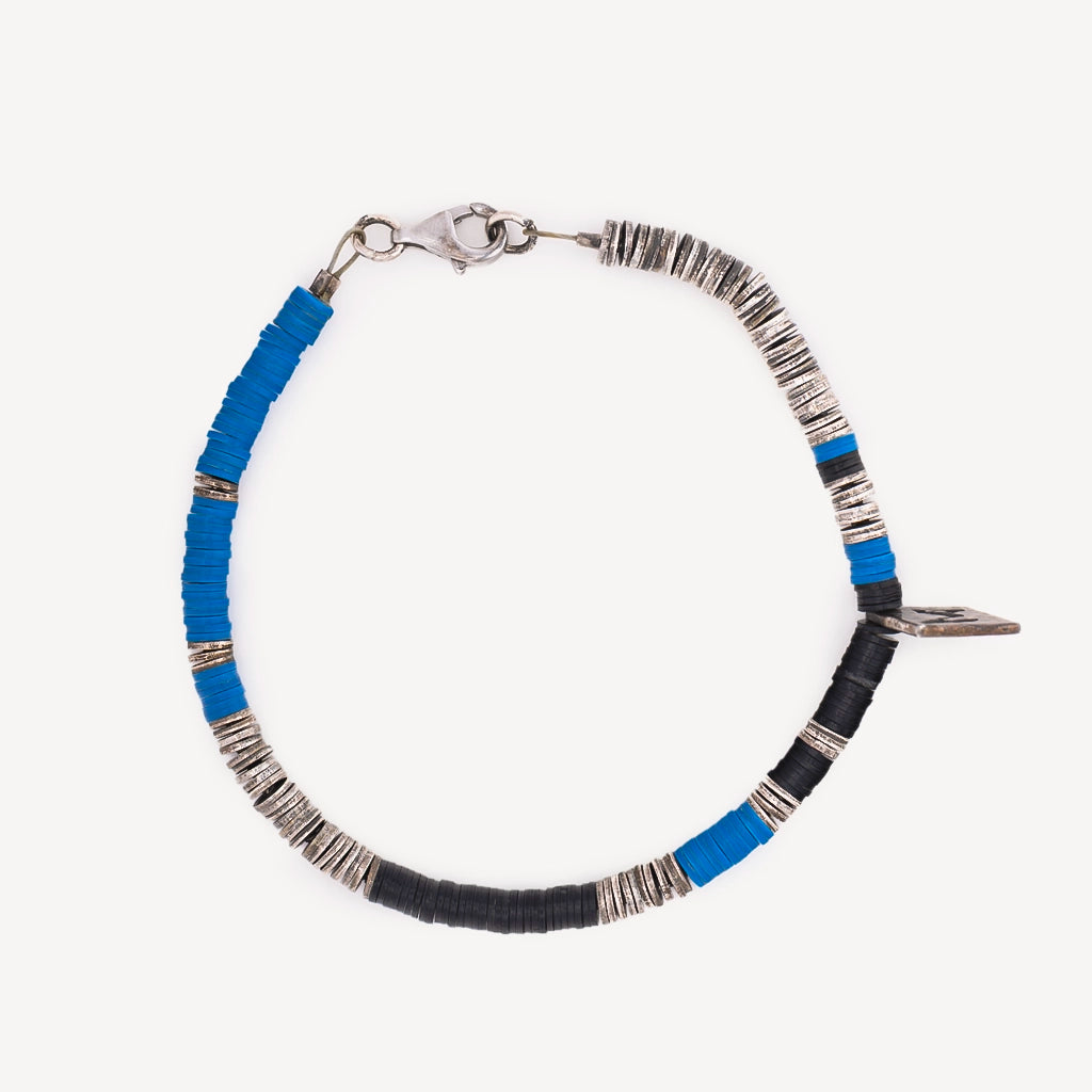 Bracelet signé M Cohen en argent avec deux coloris de perles africaines et des disques d’argent.