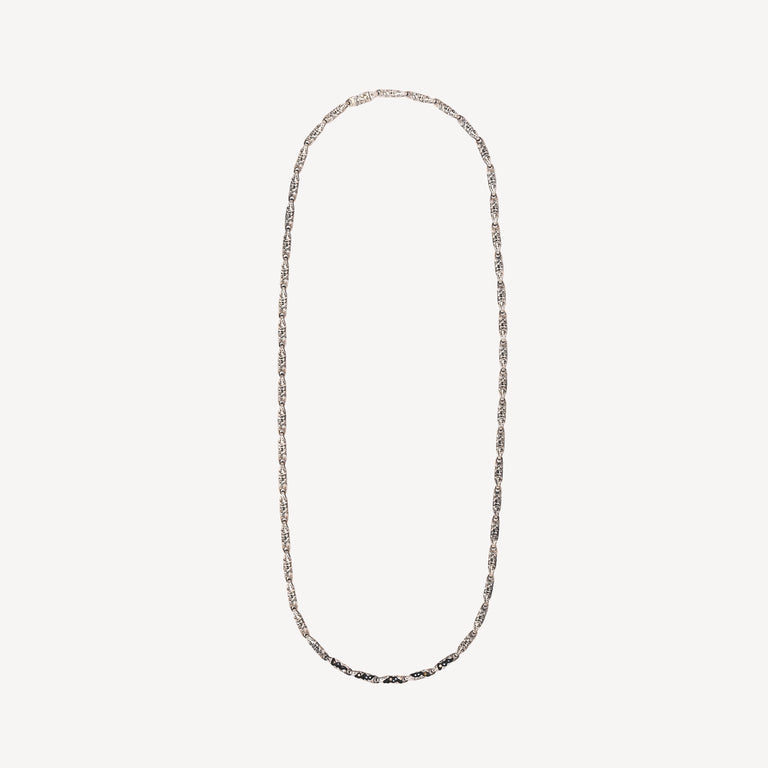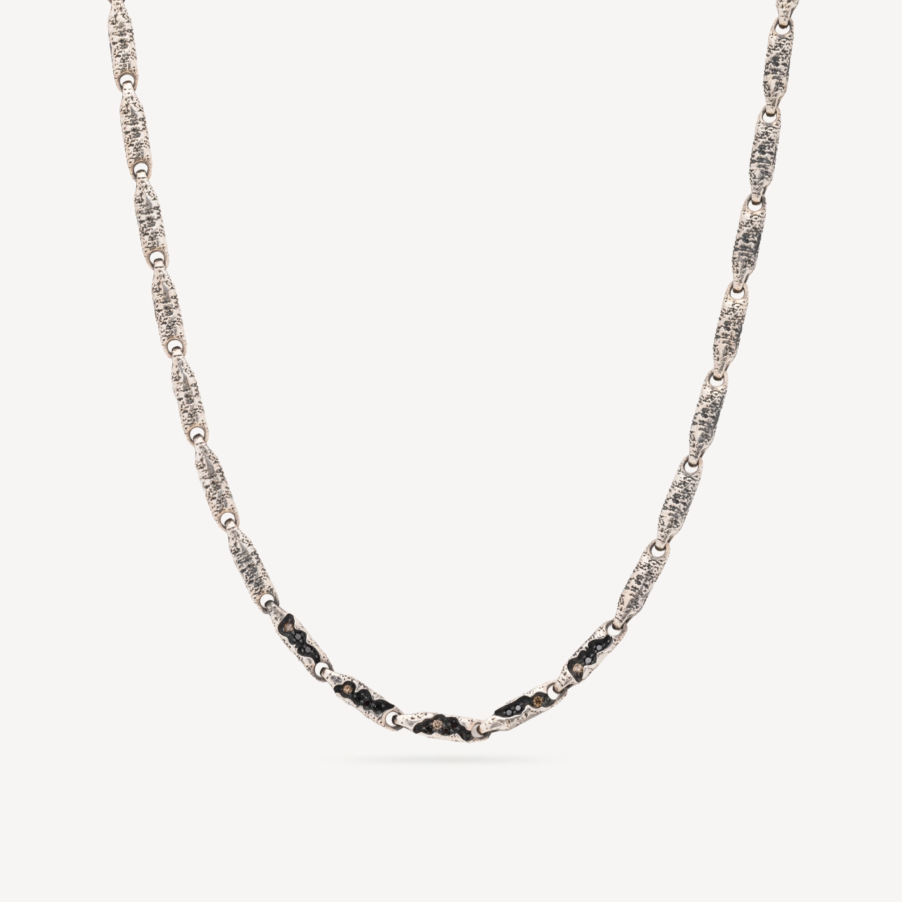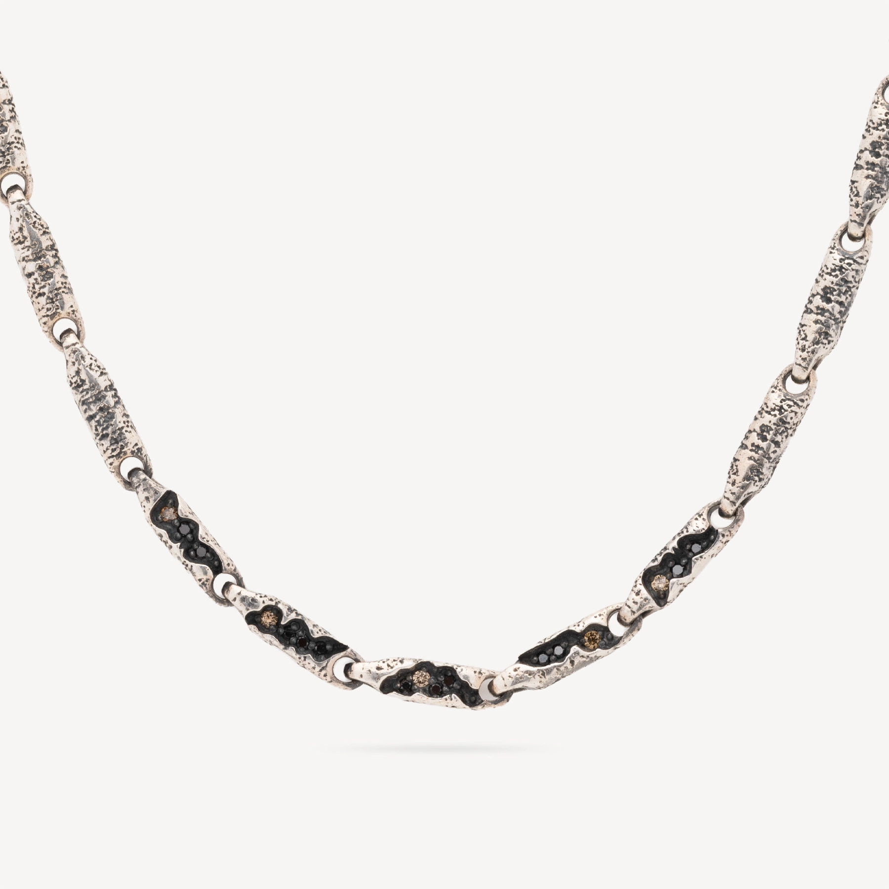 Le Collier Chasm Link, signé Carina Hardy, incarne un caractère affirmé. Confectionné en argent, il se distingue par son maillon central orné d’un mélange de diamants noirs et de diamants bruns, créant un jeu de lumière intense. Le diamant noir est associé à la protection et à la force intérieure, tandis que le diamant brun symbolise l’ancrage et la stabilité émotionnelle.