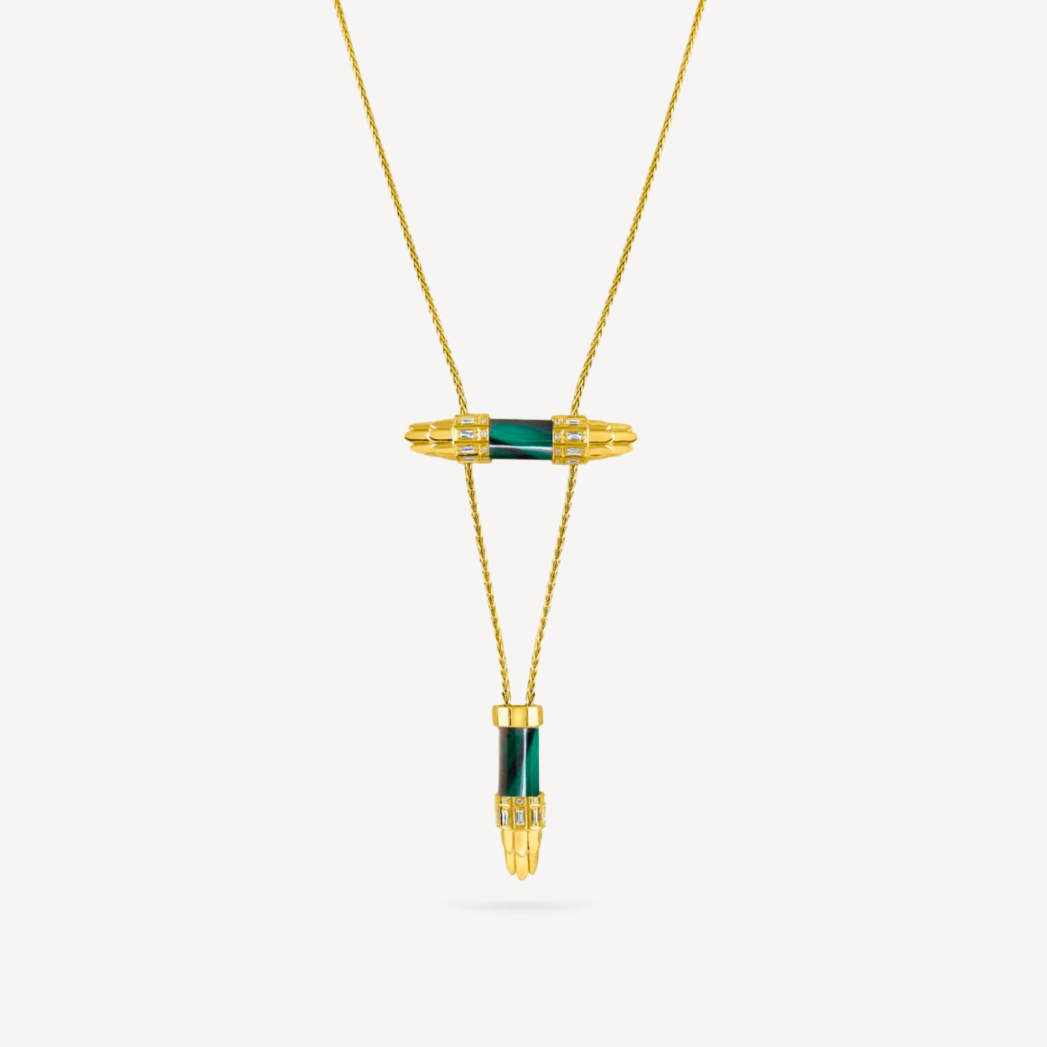 Adoptez l'élégance du collier Empire Rondelle, une pièce maîtresse de la prestigieuse collection Empire State signée Mirari. Ce collier conjugue la beauté naturelle de la malachite verte avec l'éclat pur des diamants blancs, créant un contraste saisissant qui capture la lumière. Ensemble, la malachite et le diamant blanc harmonisent le cœur et l’esprit.