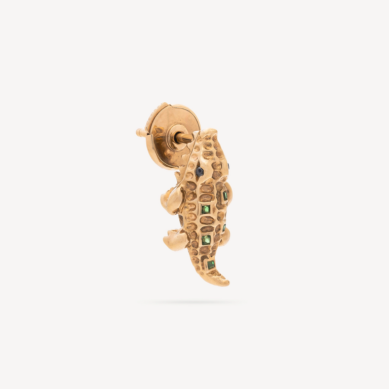Boucle d’oreille Mini Croco signée Yvonne Léon en or jaune comportant 4 tsavorites carrées sur son dos ainsi que deux diamants noirs qui composent ses yeux. Comporte un système de fermeture sécurisé Alpa.